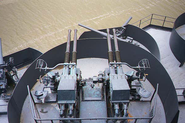 On the main deck, port side, looking to the bow. These are anti-aircraft