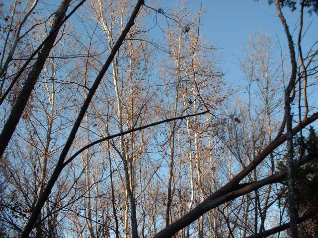 Some deciduous trees catching the last rays of the afternoon winter sunset.