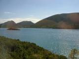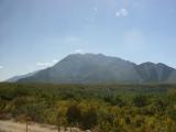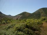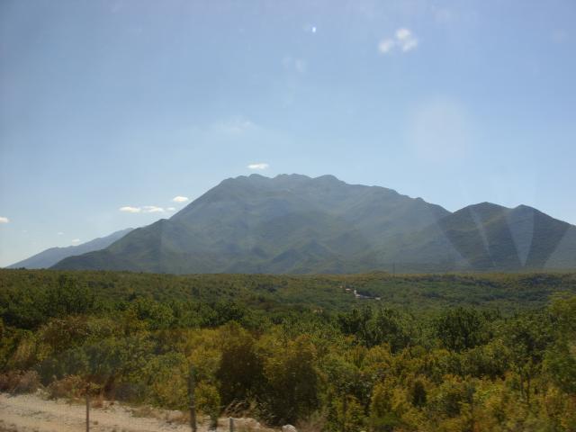On the early part of the trip, the tollway follows an inland route. The range of hills here is between the tollway and the coast. Unfortunately, many of the photos from inside the bus have reflections on the window. |