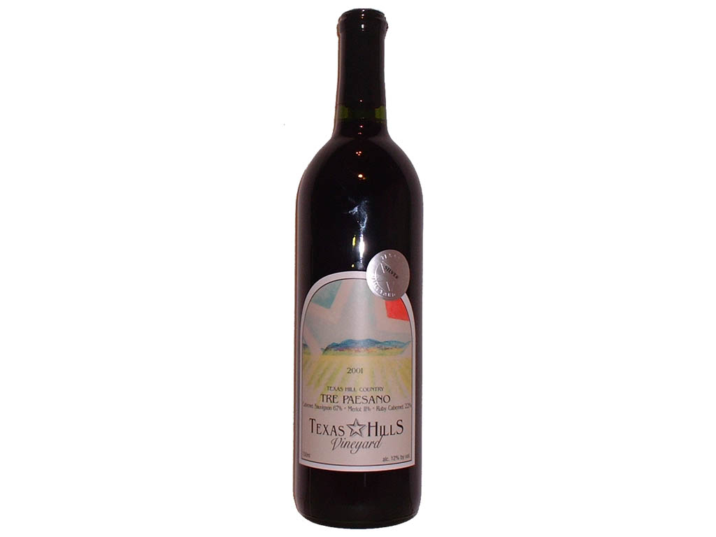 2001 Texas Hills Vineyard Tre Paesano Texas Hill Country, Texas ($16) This is currently my favorite Texas red wine. It is crisp and smooth with some wonderful flavor and very restrained texture. It is very easy to drink and quite tasty. A relatively low alcohol content (12%) makes it very food-friendly. This is a blend of Cabernet Sauvignon (67%), Merlot (11%), and Ruby Cabernet (22%). |